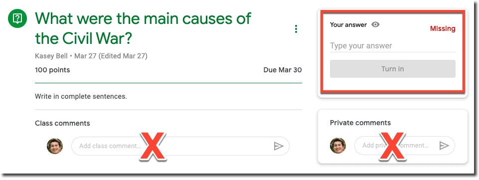 This is a common misunderstanding that I have seen in using Google Classroom. My students don’t understand where to respond to a discussion question when class comments are enabled. I end up with answers in two different places: class comments and responses to the question. Be sure you instruct your students to open the assignment and respond where indicated below.