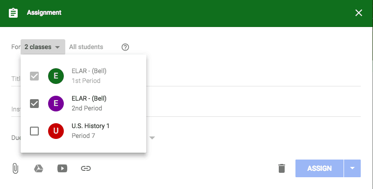 For those of you that teach the same subject across multiple class periods, you can create an assignment and distribute to multiple classes at once and save valuable time.