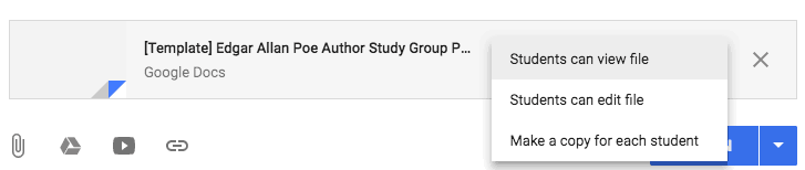 You can add attachments, links to outside resources and websites, YouTube videos, or Google Drive files to your assignment. When the file attachment is a Google Docs, Sheet, or Slide, you gain additional options for distribution and how students interact with the file.